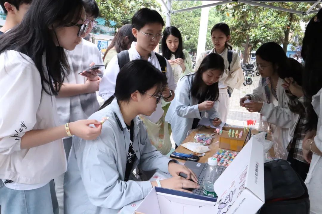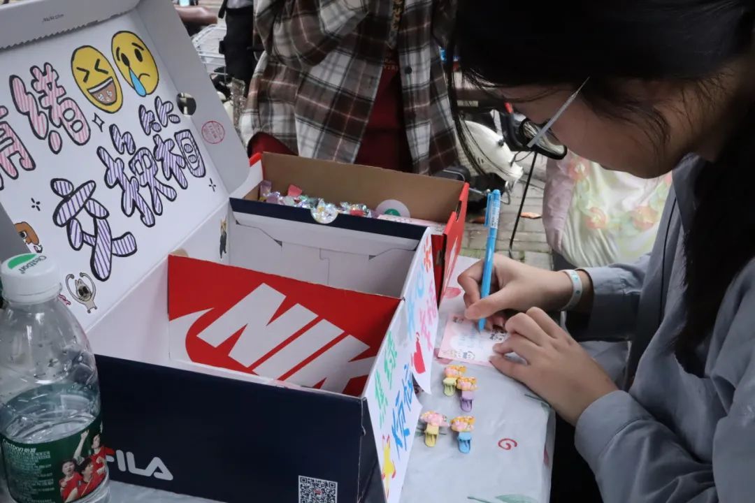 聚焦情感交互的区域,情绪交换箱与 “夸夸镜” 无疑是全场热度最高的亮点。“夸夸镜” 前,同学们或留下温暖鼓励的话语,或用五彩画笔勾勒对自我的肯定与对未来的期许;情绪交换箱旁,大家将烦恼投入箱中,抽取并分享他人的快乐瞬间,或写下鼓励回应,让这个小小的箱子成为情感传递与转换的枢纽,有效促进了师生间的情感交流与共鸣。