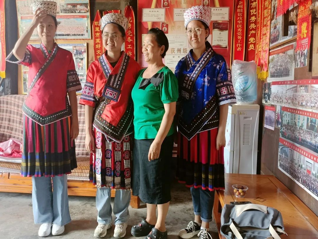 在凯棠镇梅香村,实践团成员找到了顾兰花,听她讲述带领村民脱贫致富的动人故事。情到深处,顾兰花还拿出自己刺绣的苗族服饰,为实践团成员详细介绍绣法及图案的寓意,并热情地邀请同学们试穿。“盛装穿戴”的同学们与顾兰花一起跳起了幸福的苗族舞。