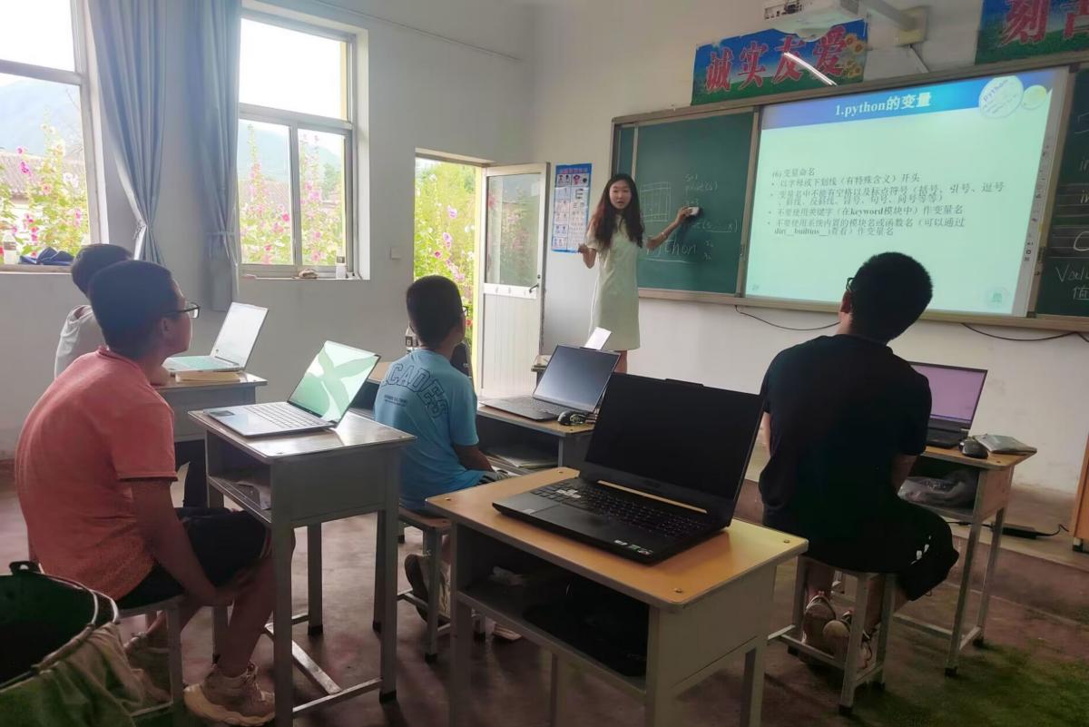 在少儿编程课上,支教团成员席瑞辰为孩子们讲解了人工智能相关的发展历程,例如AlphaGo,自动驾驶汽车等。彭澍荣则讲解了神经网络的相关知识,并演示了如何在软件上搭建3D移动场景模型。郭禹小朋友感叹道:“一行行代码组合起来竟然就能完成这么复杂的任务,我以后也想像老师们一样熟练地使用代码。”刘适雨为孩子们讲解python语言的同时,也会辅导孩子们进行实操,通过实践加深理解。“在代码成功运行出我想要的结果时,我十分开心。”在支教结束时,刘子豪小朋友已经能自己编写简单的脚本。