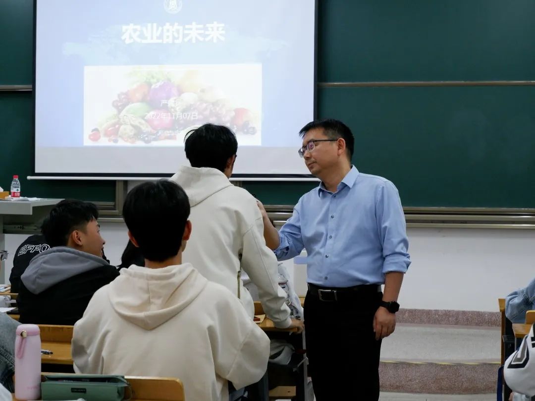 课堂最后,严建兵勉励同学们,作为中华民族伟大复兴的建设者和接班人,要好好学习,自立自强,作为华农学子,传承华农精神,做大事担大任。青年强则国强,每个人都有责任与担当,同学们在这一场讲座中获得的不仅是对“农业的未来”的深刻认知,更是从农业发展中领会到青年这个重要角色的使命所在。