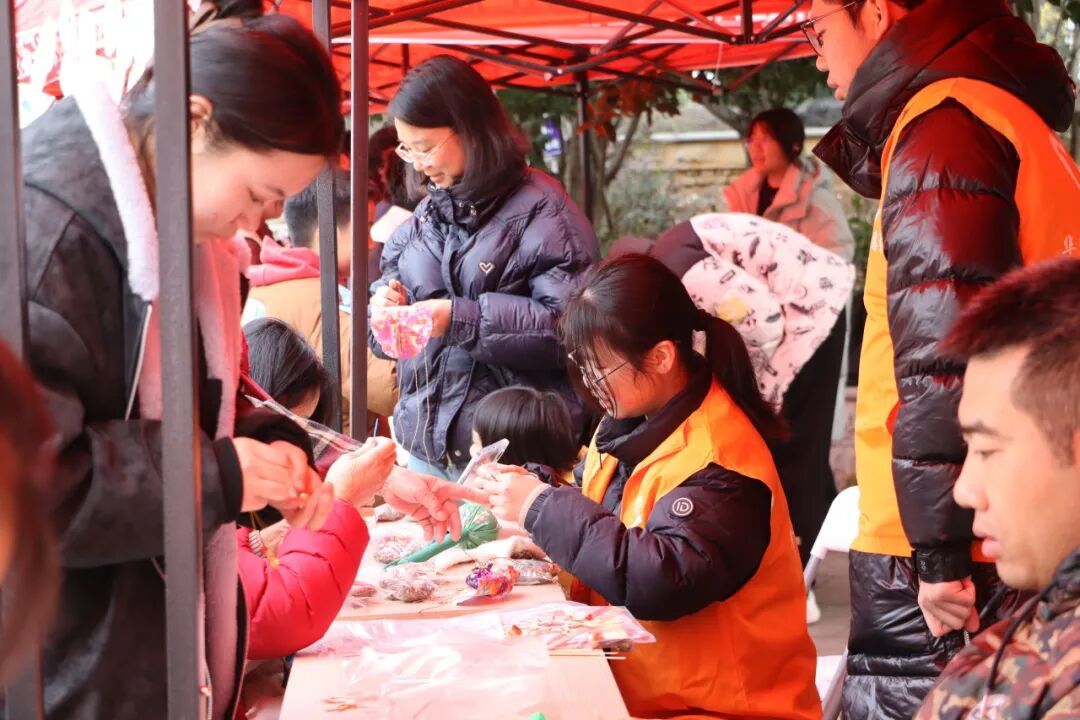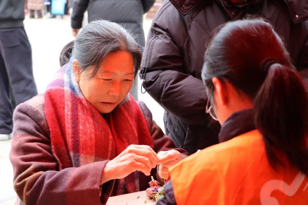 在“铃响元旦迎新岁”区域,志愿者们现场演示竹条拼装与金线缠绕的技巧,并贴心协助小朋友修剪竹条,确保活动安全进行。随着风铃逐渐成型,微风吹动铃铛,发出清脆悦耳的声响。铃铛下悬挂的“人臻五福”卡片,承载着对元旦佳节的美好祝愿,也在志愿者与参与者的协作中传递着温情。
