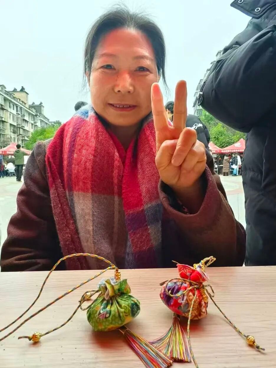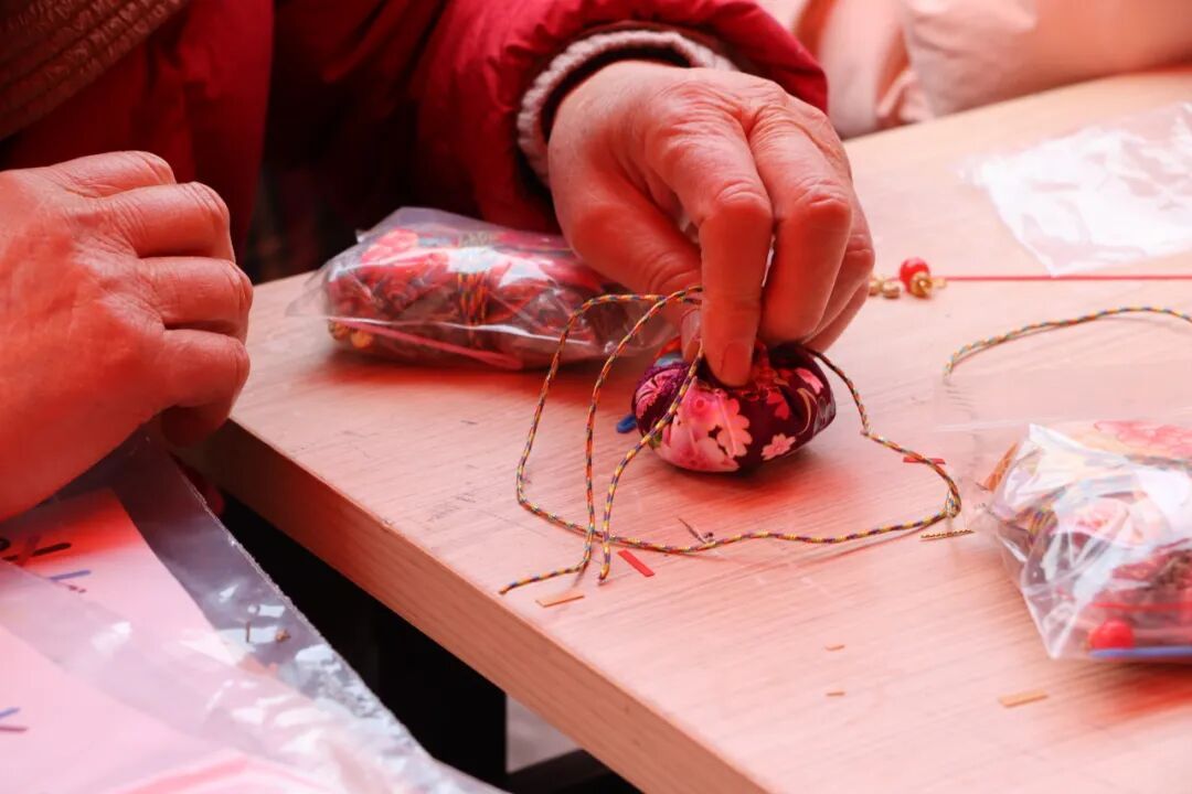 在“香囊纳福蕴情长”区域,志愿者们逐步讲解并同步演示香囊制作的关键环节,尤其注重让老年居民听得懂、学得会。讲解结束后,参与者们自由挑选布料与配饰,在志愿者一对一协助下穿针引线、填充艾草。大家依照各自的审美搭配色彩、设计样式,将平安健康的祝愿一针一线缝入香囊之中。
