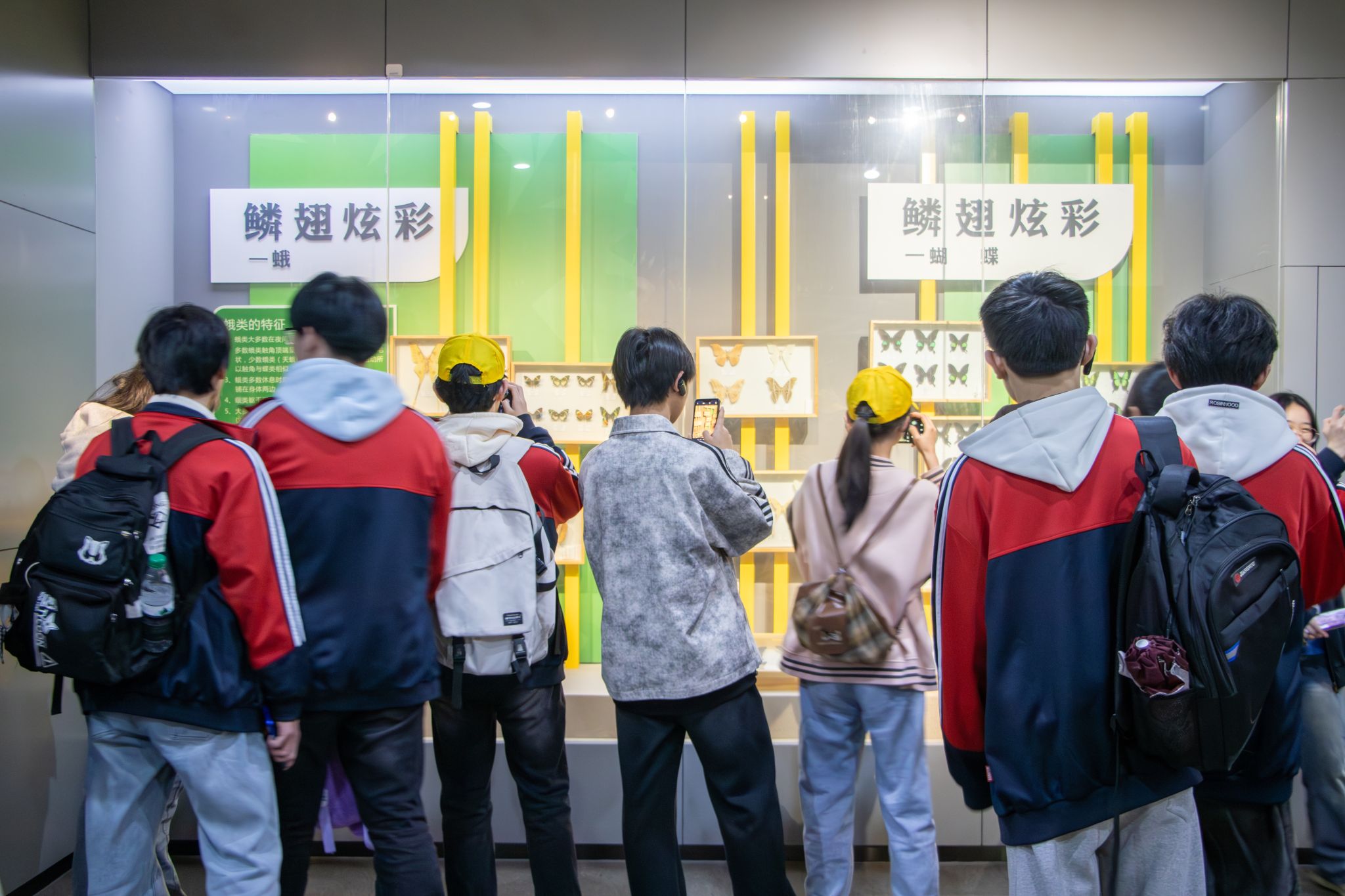 师生一行来到博物馆,参观丰富多样的自然藏品,近距离感受自然生命的风采和魅力。同学们认真观看标本,驻足讨论。在“温驯家园”展区展出的湖北白猪标本旁,讲解员胡煜为同学们介绍了我国养猪学界首位院士熊远著先生带领团队进行的瘦肉型白猪研究,同学们详细了解了培育我国首个母本瘦肉型猪的艰辛历程。