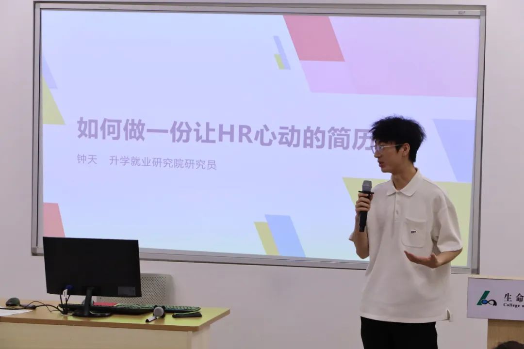 升学就业研究院研究员钟天在职业规划、简历辅导等领域经验丰富。讲座中,他直击校招底层逻辑,点明企业招聘核心需求,帮助学生找准求职方向。针对简历制作,钟天结合实际案例,指出常见误区,如内容堆砌、重点模糊等问题;通过展示优秀简历,讲解简洁表述、成果量化、岗位匹配等技巧;还分享了实用的简历制作网站和模板,助力学生打造专业简历。