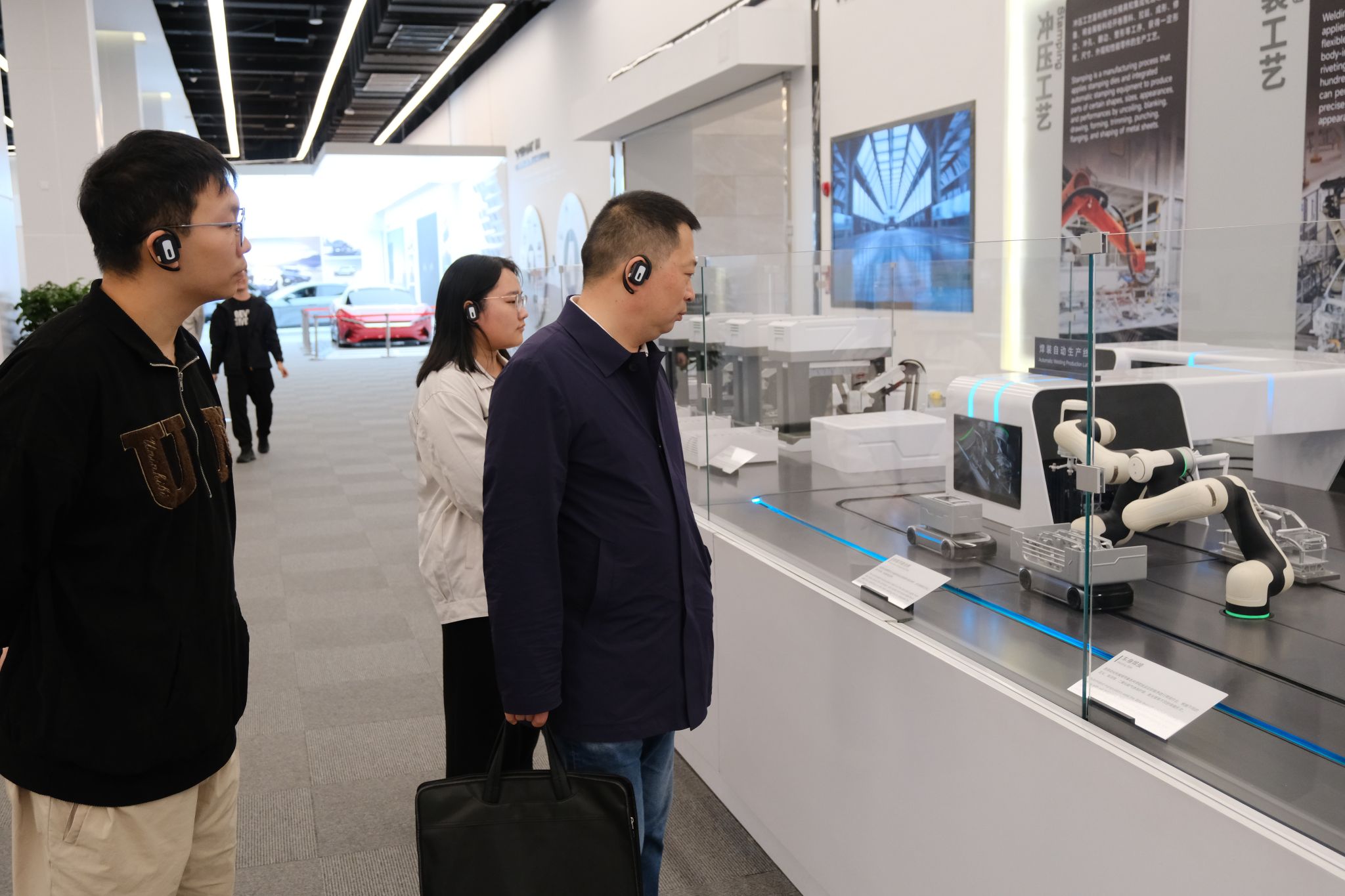 在比亚迪股份有限公司,刘进一行参观了企业展厅,详细了解了比亚迪在新能源汽车、智能网联等领域的技术突破与产业布局,双方就人才结构、招聘需求等话题交流。