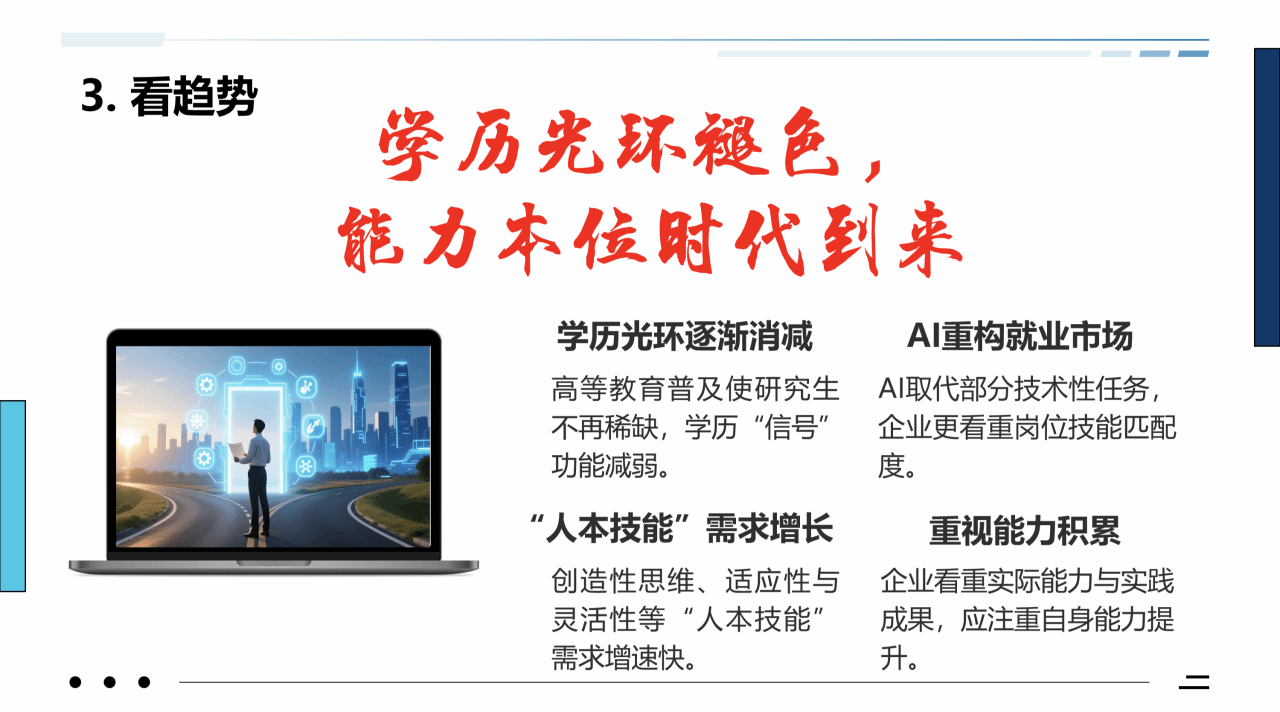 “学历光环正在褪色,能力本位的时代已经到来。”刘进引用麦可思研究院观点指出,高等教育普及化叠加AI技术冲击,企业招聘愈发看重“岗位技能匹配度”。世界经济论坛《未来就业报告》亦将创造性思维、适应性与灵活性列为关键能力。“你们在宿舍打掉的每一分钟,都是在浪费最宝贵的‘能力积累期’。”