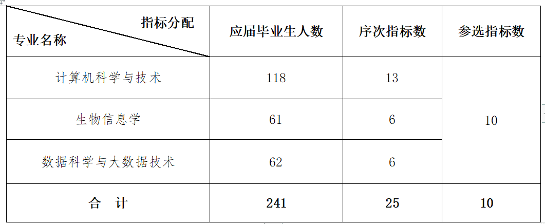 序次指标根据各专业应届毕业生人数比例(四舍五入取整)分配到各专业,由符合基本条件的学生申请。审评小组进行资格审核后,依据学业成绩排名从高到低依次遴选。