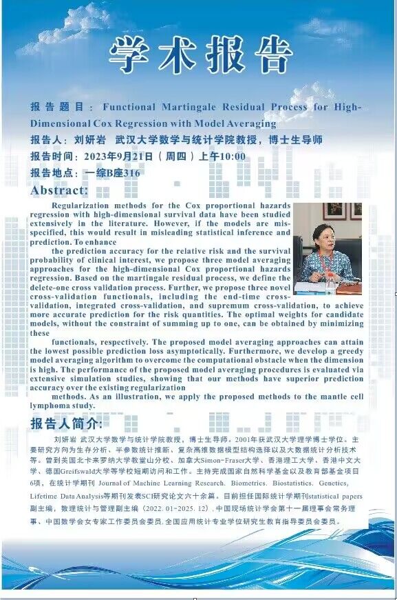 教授,博士生导师。2001年获武汉大学理学博士学位。主要研究方向为生存分析、半参数统计推断、复杂高维数据模型结构选择以及大数据统计分析技术等。曾到美国北卡来罗纳大学教堂山分校、加拿大Simon-Fraser大学、香港理工大学、香港中文大学、德国Greifswald大学等学校短期访问和工作。主持完成国家自然科学基金以及教育部基金项目6项,在统计学期刊 Journal of Machine Learning Research, Biometrics, Biostatistics, Genetics,Lifetime Data Analysis等期刊发表SCI研究论文六十余篇。目前担任国际统计学期刊statistical papers 副主编,数理统计与管理副主编(2022.01-2025.12),中国现场统计学会第十一届理事会常务理事、中国数学会女专家工作委员会委员,全国应用统计专业学位研究生教育指导委员会委员。