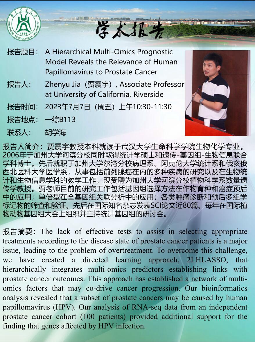 报告人简介:贾震宇教授本科就读于武汉大学生命科学明星换脸av 生物化学专业。2006年于加州大学河滨分校同时取得统计学硕士和遗传-基因组-生物信息联合学科博士。先后就职于加州大学尔湾分校病理系、阿克伦大学统计系和俄亥俄西北医科大学医学系,从事包括前列腺癌在内的多种疾病的研究以及在生物统计和生物信息学科的教学工作。现受聘为加州大学河滨分校植物科学系数量遗传学教授。贾老师目前的研究工作包括基因组选择方法在作物育种和癌症预后中的应用;单倍型在全基因组关联分析中的应用;各类肿瘤诊断和预后多组学标记物的筛查和验证。先后在国际知名杂志发表SCI论文近80篇。每年在国际植物动物基因组大会上组织并主持统计基因组的研讨会。