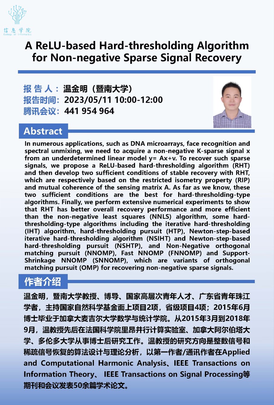里昂并行计算实验室、加拿大阿尔伯塔大学、多伦多大学从事博士后研究工作。温教授研究方向是整数信号和稀疏信号恢复的算法设计与理论分析,以第一作者/通讯作者在Applied and Computational Harmonic Analysis、IEEE Transactions on Information Theory、IEEE Transactions on Signal Processing等期刊和会议发表50余篇学术论文。