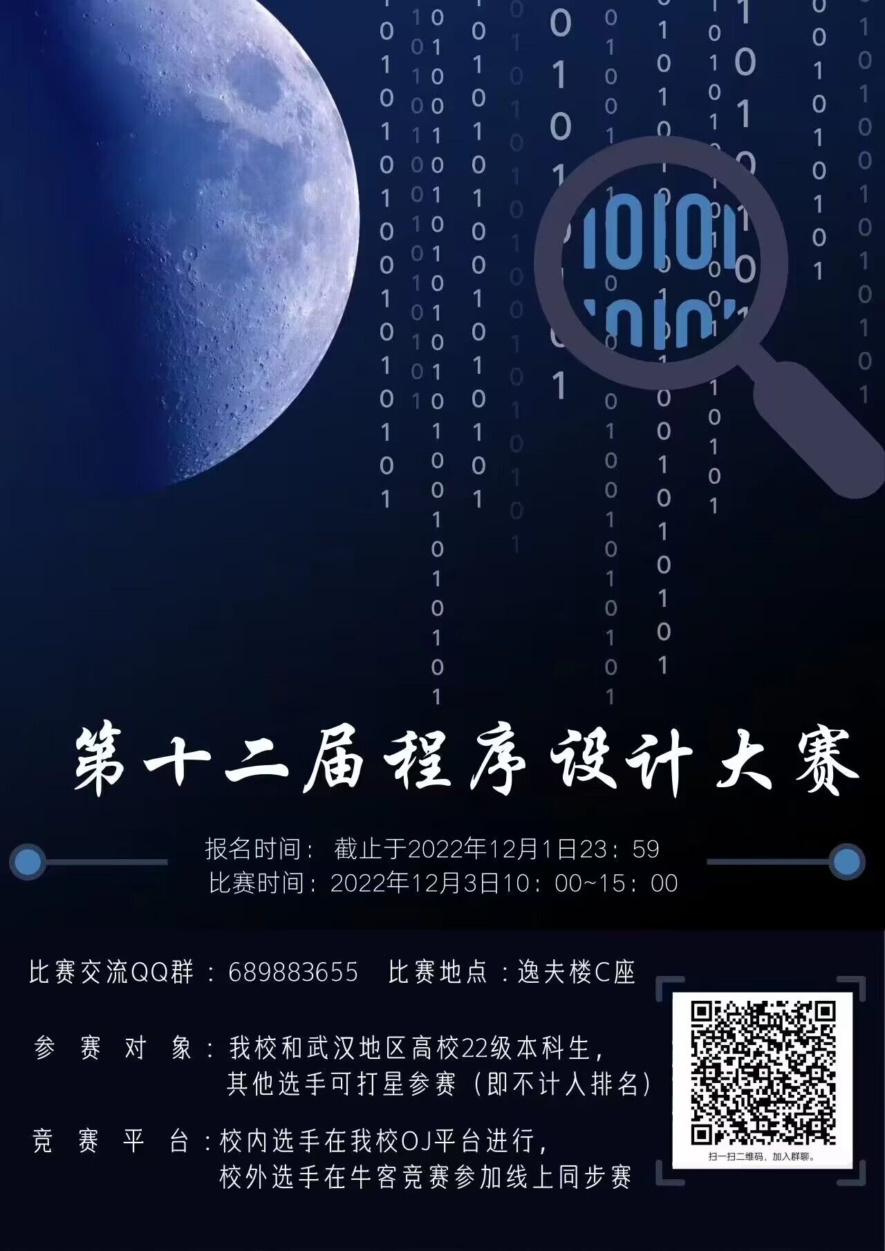 第十二届程序设计大赛(新生赛)暨武汉地区高校程序设计网络邀请赛(新生赛)。