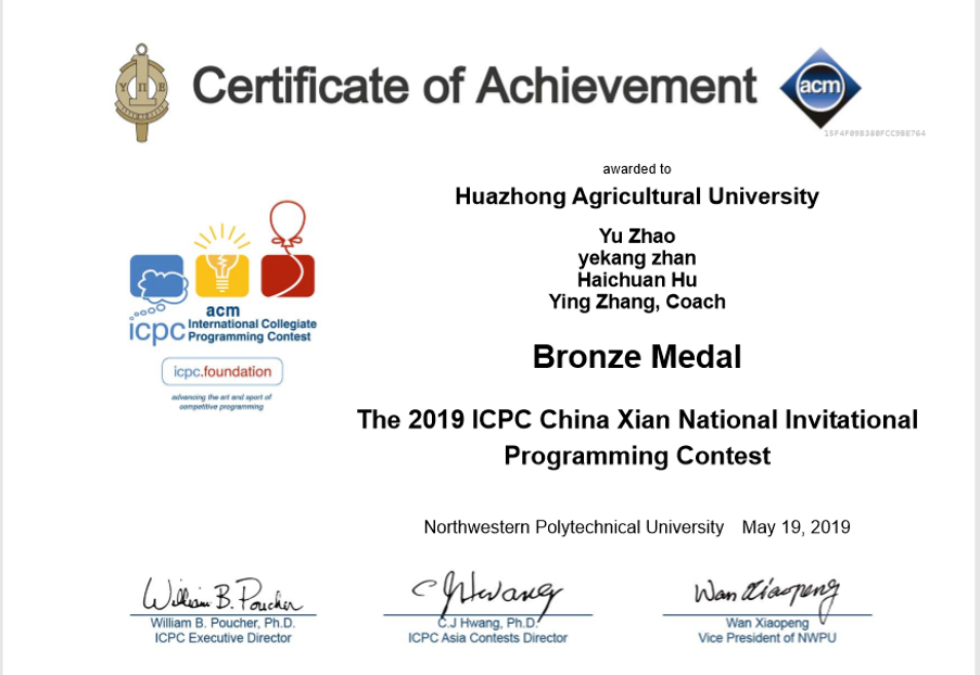 2019年ACM国际大学生程序设计竞赛全国邀请赛西安站——铜奖