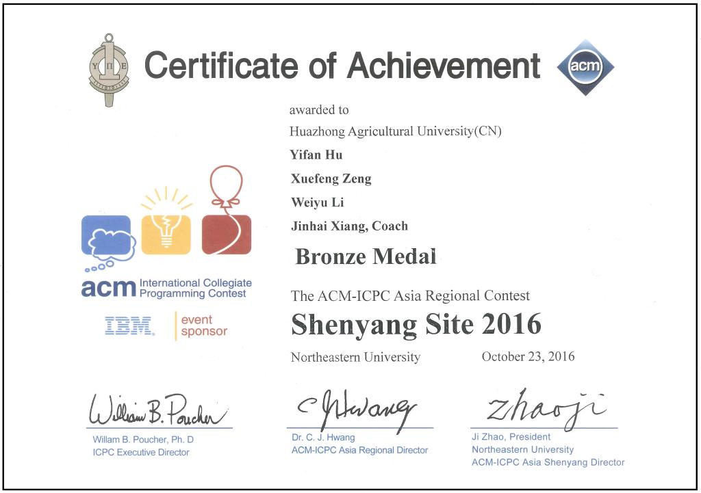 2016年ACM国际大学生程序设计竞赛亚洲区域赛沈阳站——铜奖