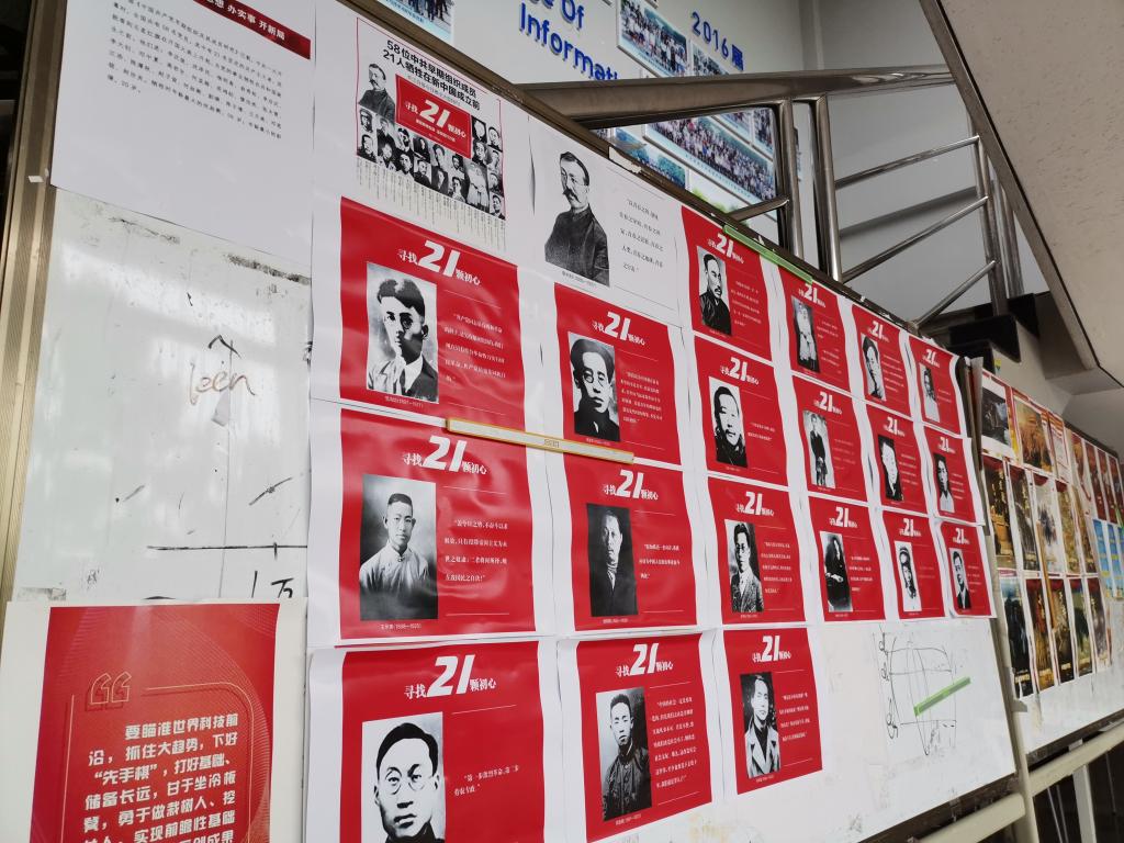 5月12日上午,“寻找21颗初心”主题图片展在明星换脸av 1楼大厅公告栏展出。