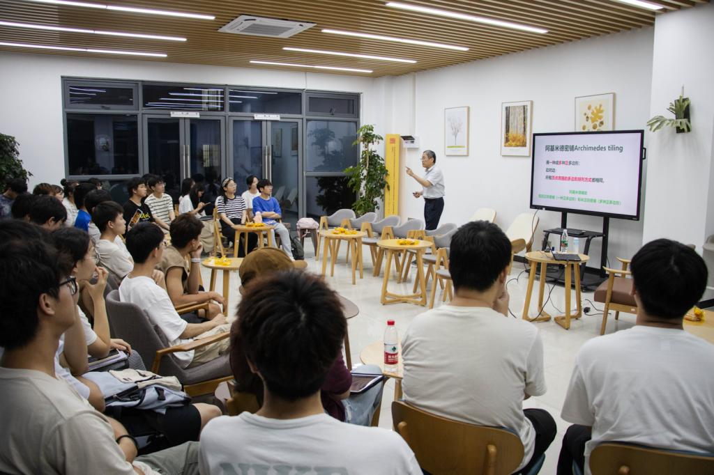 “密铺是现实生活中比较常见的现象,对原本简单的图形作密铺,可能会实现令人称奇的艺术效果。”林亚南从阿基米德的密铺原理说起,他带领大家回顾了北京冬奥会“大雪花”点火台的设计原理,由此介绍了数学在现代建筑设计中的应用,并以凸多边形平面铺砌的历史故事和非周期铺砌的漫长研究历程为例,阐释了数学精神的魅力所在。