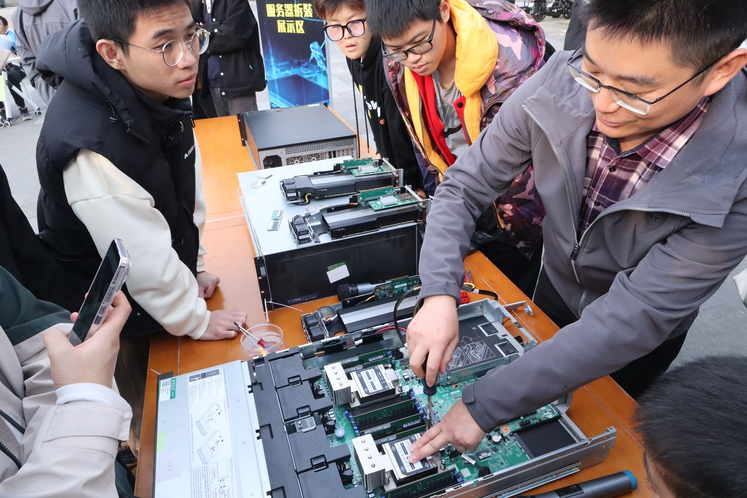 在服务器拆解现场,研一同学曾令宇和郑忠洋交流了专业知识,他坦言,自己以往的知识体系更侧重于理论层面,“在日常使用服务器的过程中,我时常会遇到一些难题。而这次活动让我得以亲手操作,通过与老师的直接交流,我在硬件领域获得了前所未有的深刻认识。”