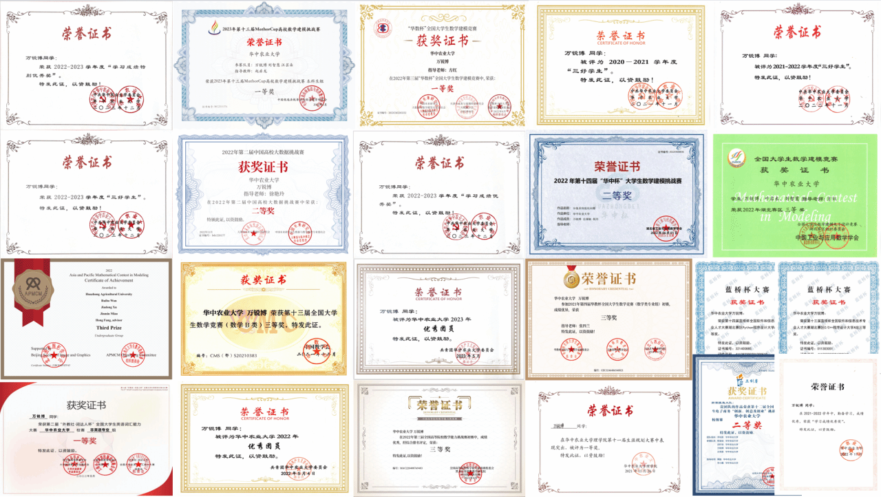 在竞赛方面他同样小有成就,获得全国大学生MathorCup数学建模竞赛国家一等奖等十余项省级以上竞赛奖项,涵盖数学竞赛、数学建模、程序设计、英语、创新创业等多个领域。