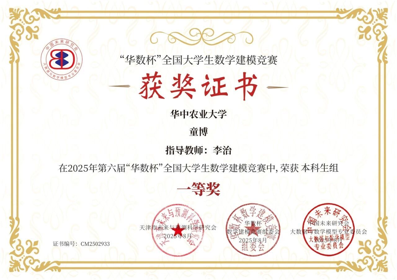 在打牢学科基础的同时,童博积极参与各种学科竞赛,充分筹备,优秀发挥,取得一系列成绩:全国大学生数学竞赛国家级二等奖,美国大学生数学建模竞赛国家级二等奖,华数杯、华中杯大学生数学建模竞赛的省级三等奖、一等奖。为了将所学的丰富科学知识应用于实践,他还参与李秀婷老师指导的省级大创项目《基于动态模式分解的锂电池寿命预测》,通过科学研究,为锂电池剩余电量预测提供数据驱动方法。