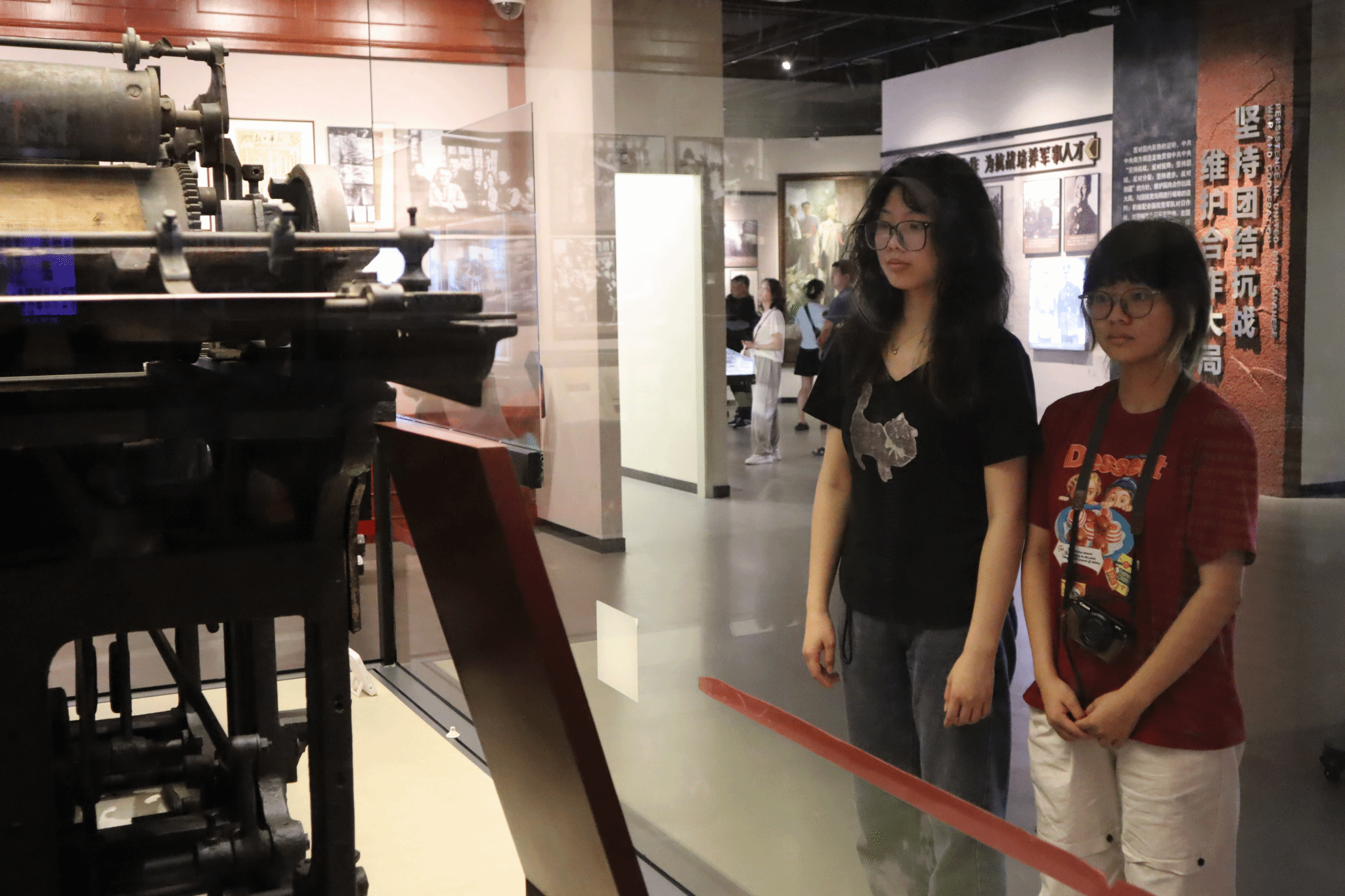 团队成员王小倩、蔡佳颖参观新华日报印刷机 朱迅摄