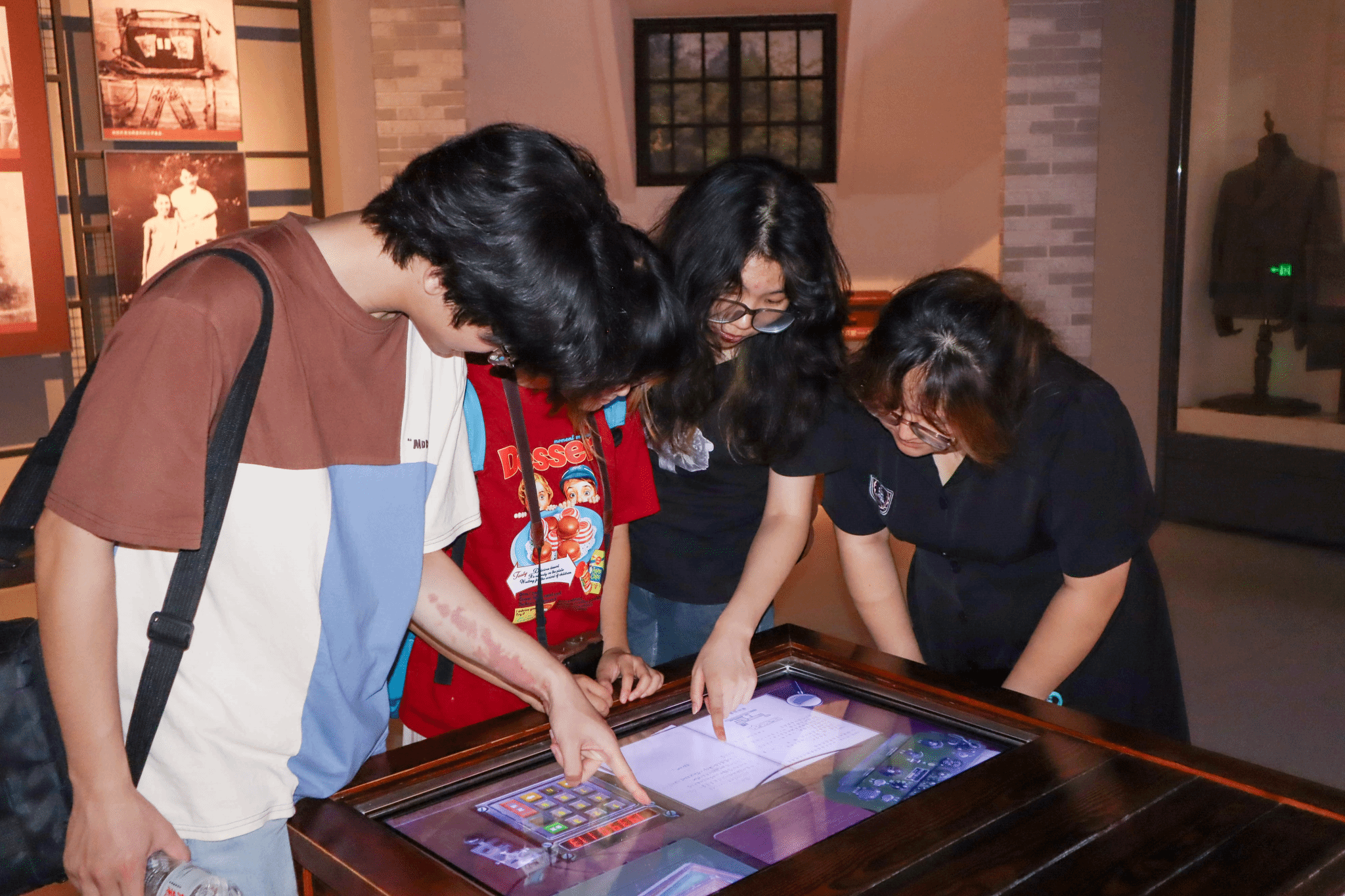 团队还体验了馆内的“红岩记忆数字体验厅”。在模拟电报操作台区域,几位团队成员围站在复刻的老式电报机前,按照屏幕上提示的密电码表,尝试将“坚持斗争”四个字转换成长短不一的电码符号。当系统显示解码成功,屏幕上跳出当年南方局同志发出的真实电文片段时,成员们都不由自主地凑近屏幕,目光紧紧锁定那些带着历史温度的文字,仿佛真切感受到了当年电文发出时的那份喜悦。实践团队成员陈浩说:“数字媒体技术让大家身临其境的感受历史事件,在刚才亲手操作电报机解码的瞬间,课本里的文字突然有了温度,成员们切身感受到了当年南方局同志们传递消息时的谨慎与坚定。”