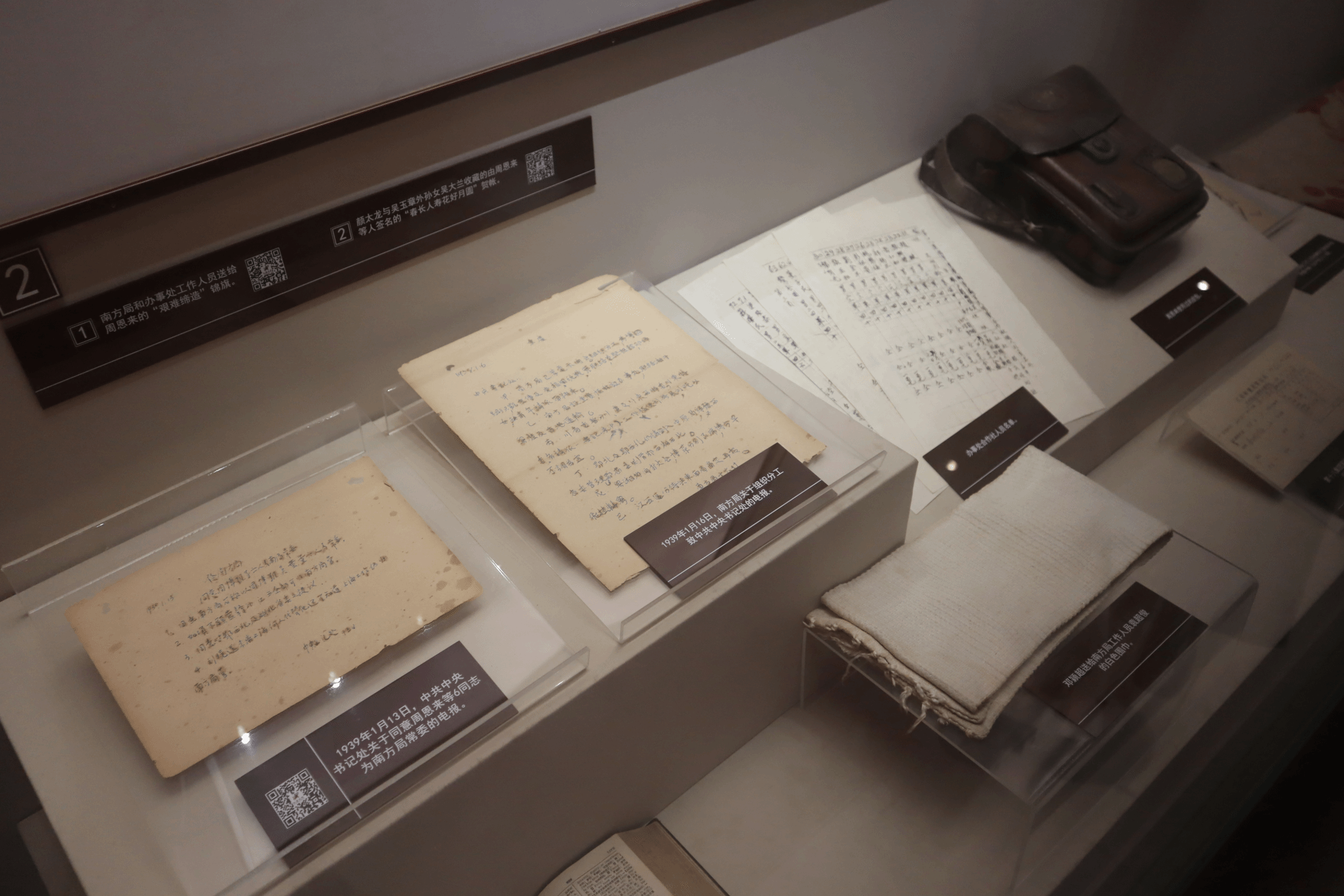 在讲解员引导下,实践团队成员们认真参观“千秋红岩 —— 中共中央南方局历史陈列”展区,通过大量珍贵文献、实物、影像资料等史料,深入了解周恩来、董必武等老一辈无产阶级革命家在重庆领导南方局工作的重要历程。展柜内,一份边角微卷的电报原件呈现出岁月留下的黄色。墨迹有部分晕开,但“南方局设重庆桂林办事处联络湘干粤桂及香港运输”等工作分配内容仍可清晰辨认。