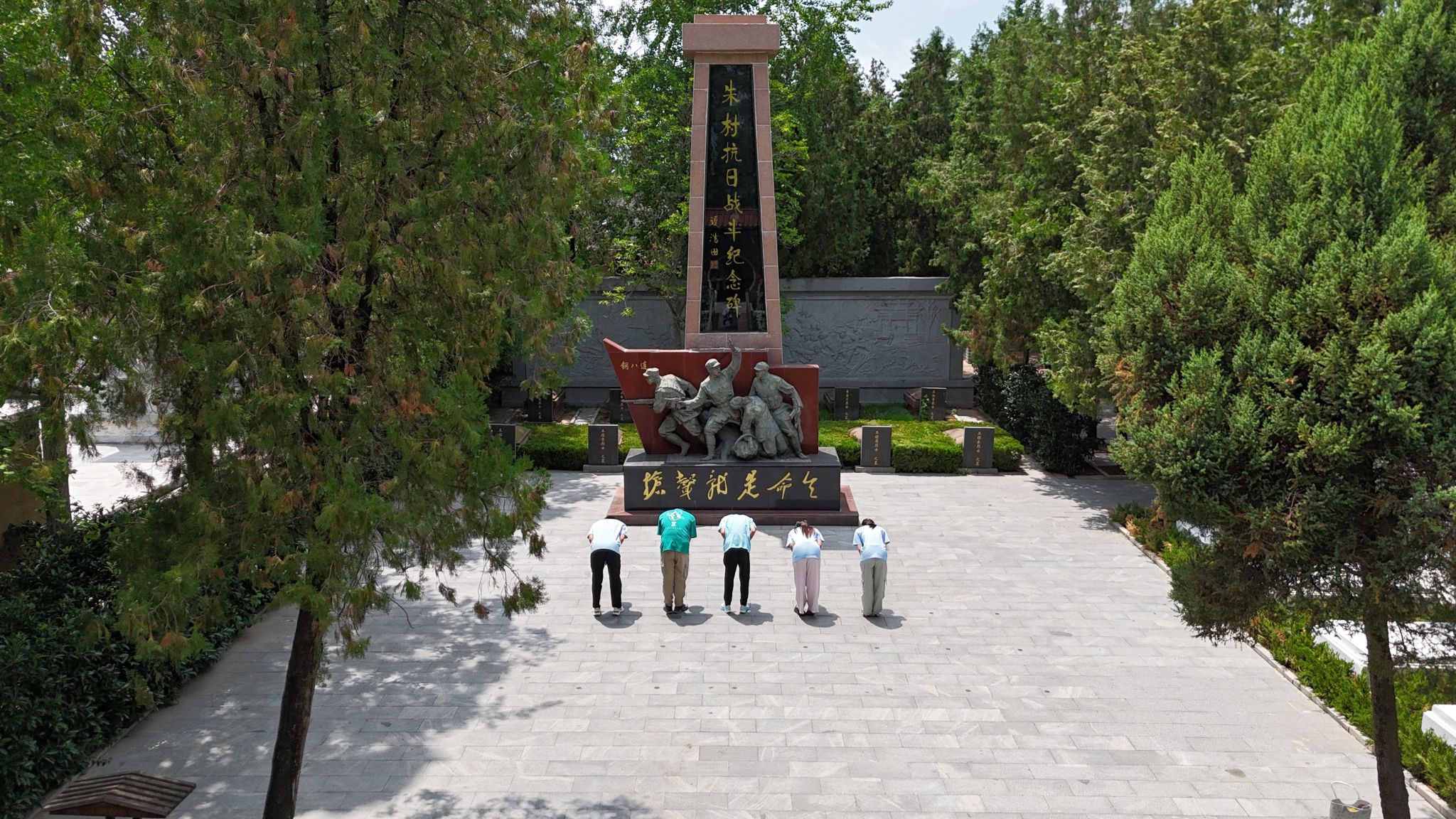 图为团队成员在朱村抗日战斗纪念碑前鞠躬致敬。张舒桐 供图