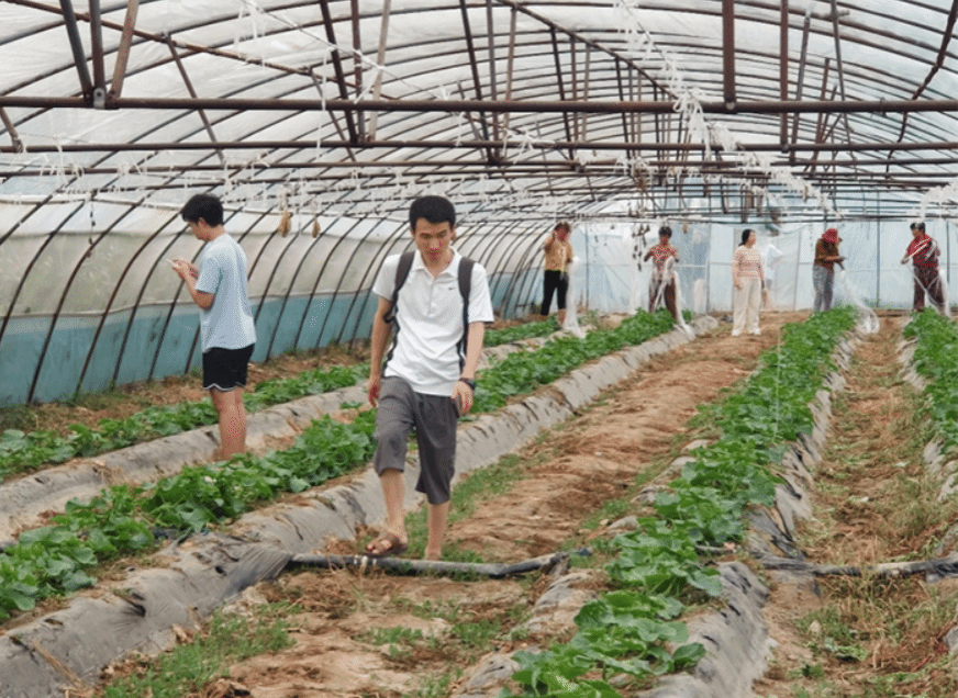 团队成员与童言老师一起在蜜瓜大棚中采集病虫害图片 杨昊 摄